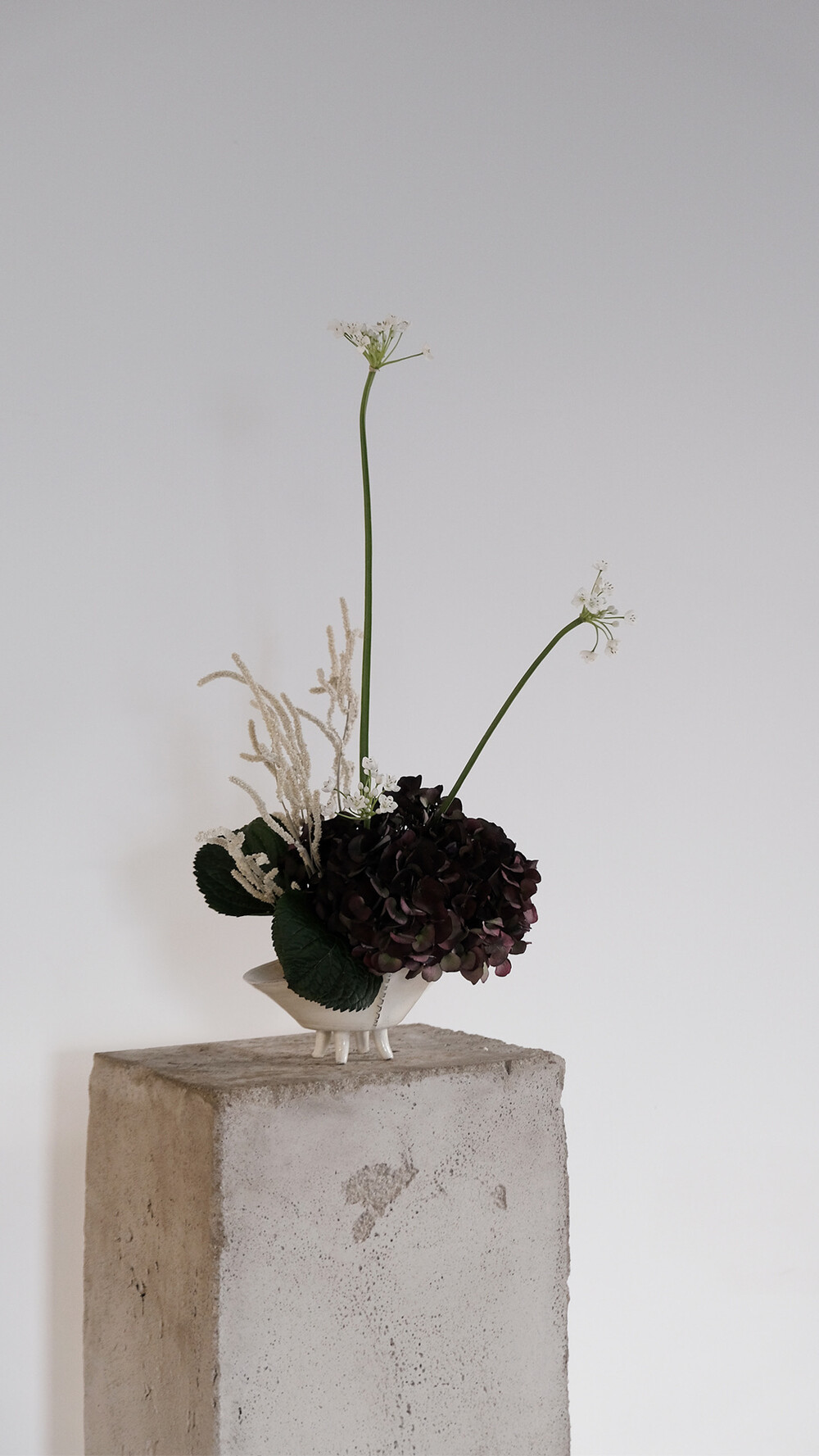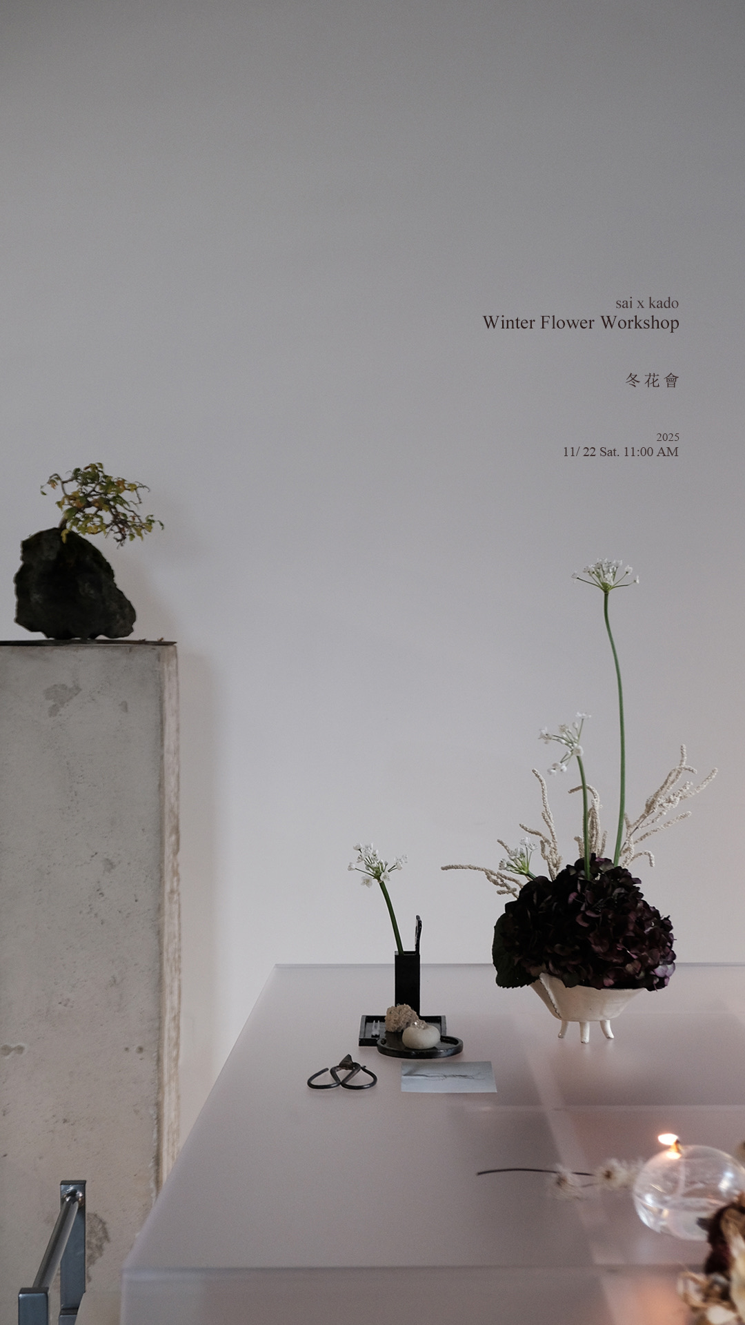 kado의 플라워 클래스에서 한 송이의 겨울을 꽂으며, sai의 와가시와 차가 이 시간의 향을 더합니다.